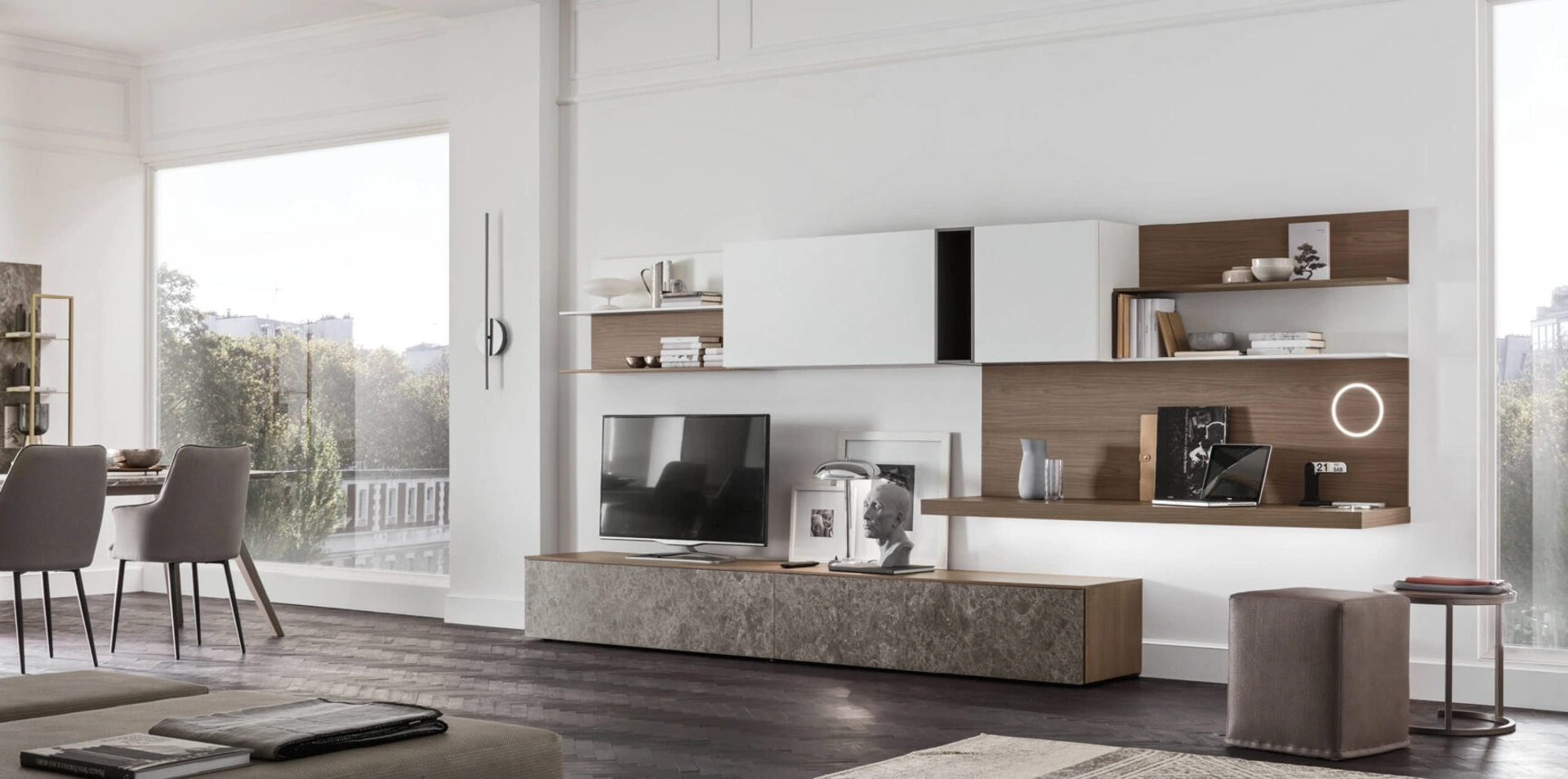 Dato che il living deve essere uno spazio agevole e di grande valore estetico, sono molto utili alcuni arredi belli e funzionali come le Pareti Attrezzate. Lasciati affascinare da una ricca gamma di arredi per la zona giorno e troverai la parete attrezzata che fa per te. Maronese offre a catalogo innovativi modelli di mobili soggiorno, diversi per stile e conformazioni, texture e componenti: scopri in negozio l'Arredamento Casa dei migliori produttori. La Parete Attrezzata Seta Comp SA2230 di Maronese in foto è una delle più esclusive soluzioni d’arredo sul mercato: componibilità personalizzabile e le varie opportunità di progettazione la rendono pratica e sofisticata.